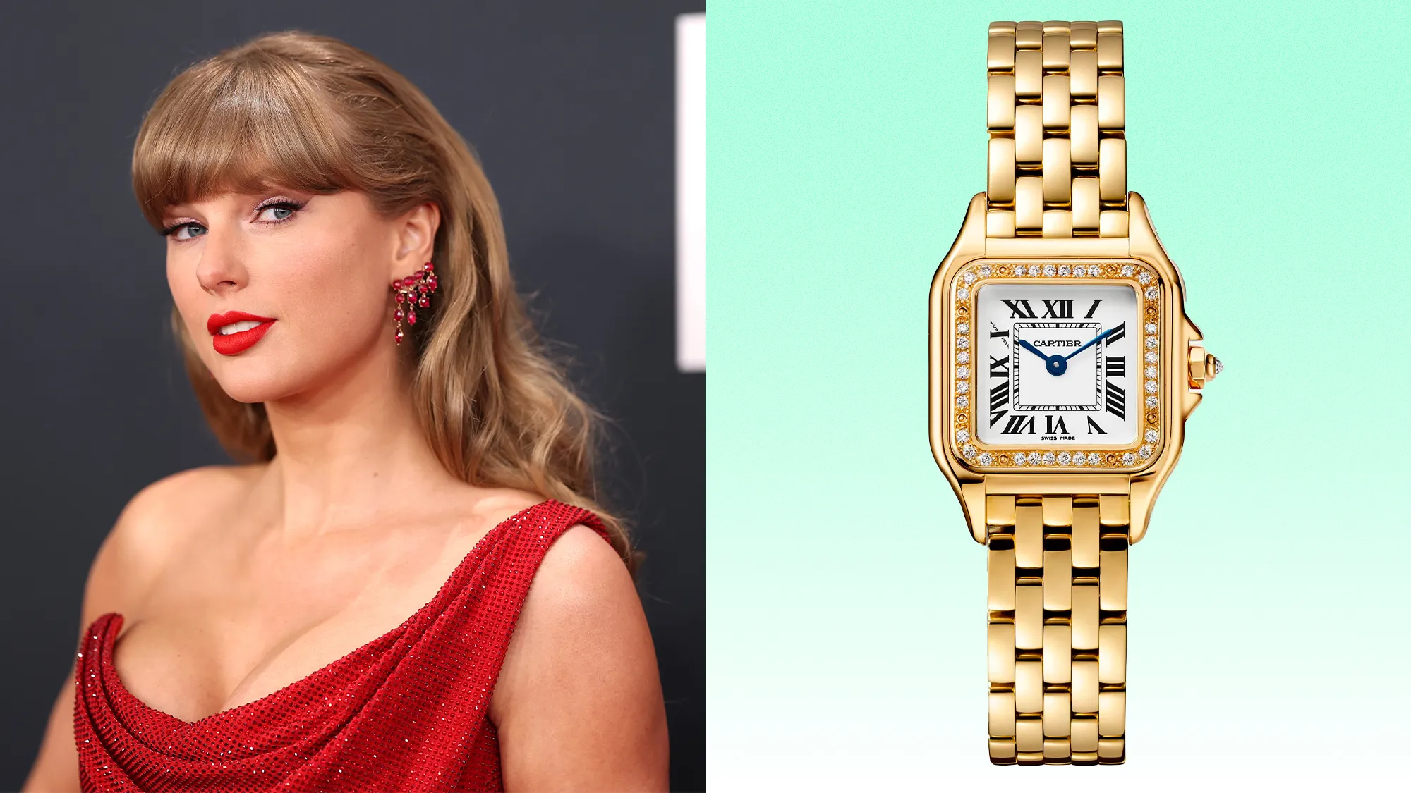Swift took the mic of New Heights wearing her gorgeous Cartier Panthère in diamond-studded yellow gold. It’s a watch we’ve seen her celebrate many a special occasion in—most notably Kelce’s third straight Super Bowl trip earlier this year—and one very in line with Swift’s sensibilities. The Panthère is an undeniable classic of Cartier’s, usually coming in tiny cases and thin bracelets.