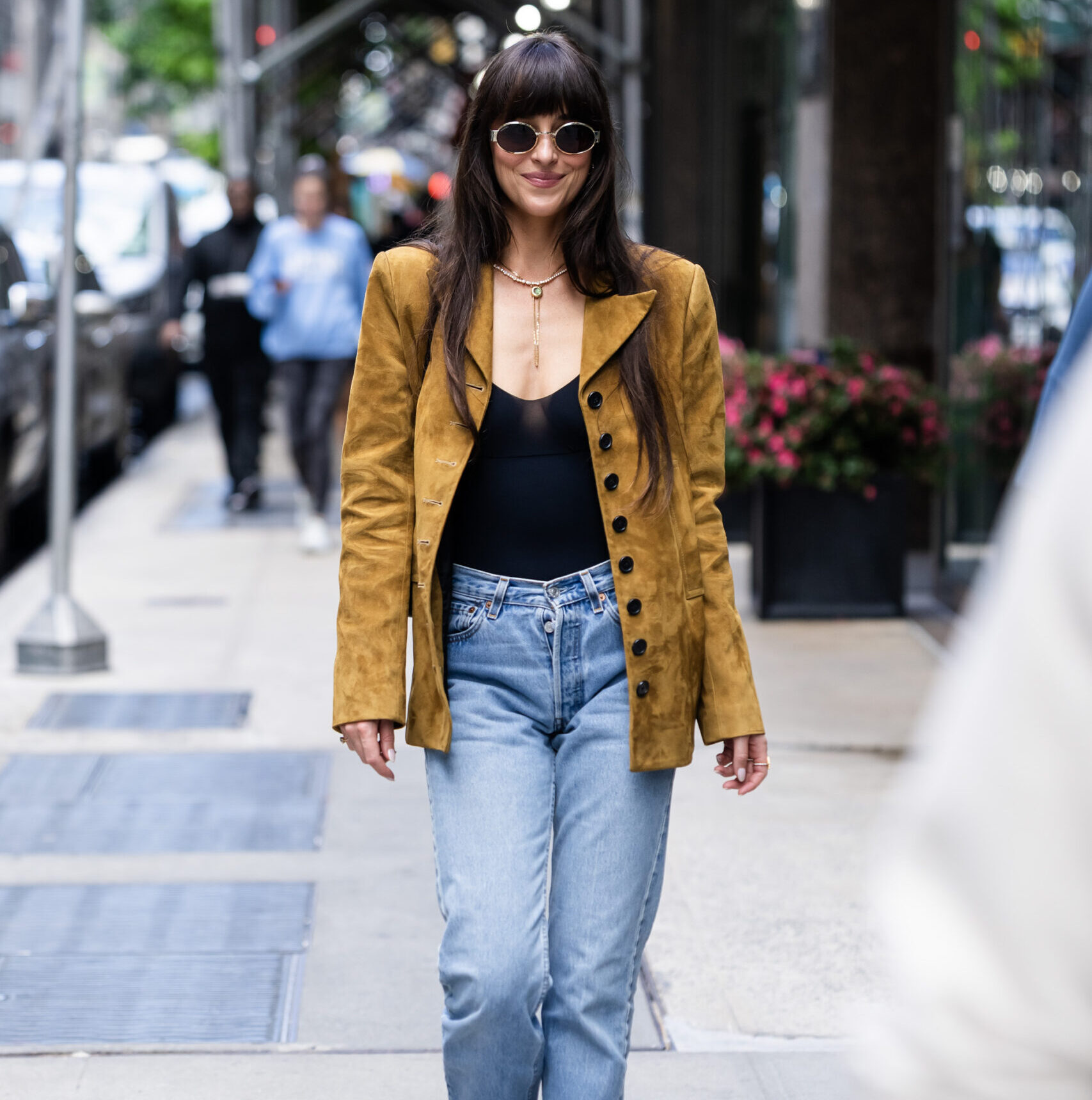 通常女士們想穿搭顯瘦,都會選 sknny jeans。不過 Dakota Johnson 則為我們示範了上緊下寬的休閒穿搭,將上身換成幼帶背心,露出更多手臂,讓造型更具呼吸感;要不然,天氣太熱不想穿緊身衣服,將上身的寬鬆恤衫或冷杉收進牛仔褲內,也能提高腰線,看上去腿部比例更修長。若想帶出一點復古韻味,也可以紮一個丸子頭,配一條低腰寬鬆牛仔褲。